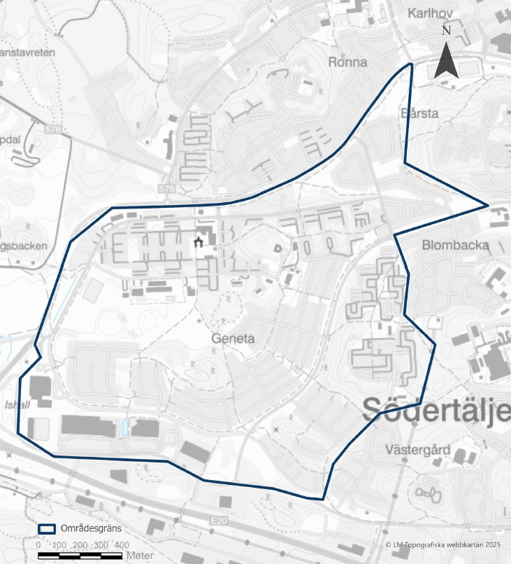 Geneta hör till de områden i Södertälje där polisen bedömer att problemnivån är allvarligast. Kartan visar ett stort område kring centrala Geneta, med omfattande bostadskvarter och skolor