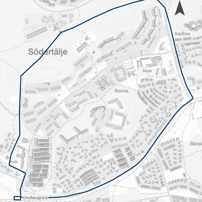 Ronna fortsätter att vara ett av polisens mest prioriterade områden i Södertälje. Kartan visar ett stort sammanhängande område norr om centrum, med många flerfamiljshus, skolor och offentliga ytor.